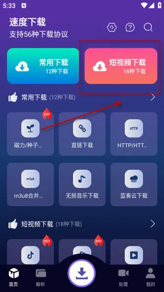 打开速度下载app,进入“短视频下载”板块,找到“抖音”对应的解析入口,将复制的抖音链接粘贴到输入框,点击“解析”按钮。
