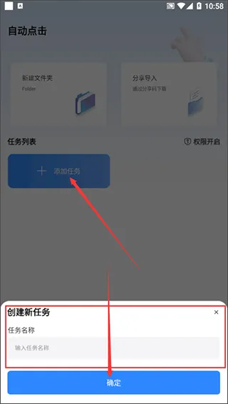 1、打开自动按键点击app,进入软件后授予软件运行所必需的权限,在首页的“任务列表”下点击“添加任务”,输入任务名称,点击确定即可进行下一步;
