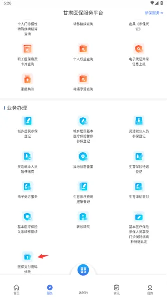 1、参保群众可通过登录甘肃医保服务平台APP,在“服务”区域内,定位至“业务办理”模块,选择【医保支付密码修改】功能进行密码修改。