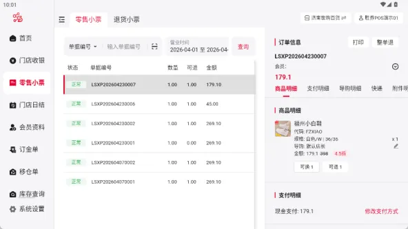 3、支持门店零售小票的打印与收藏明细;